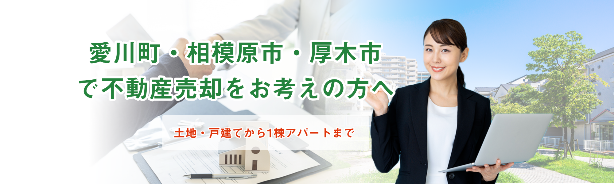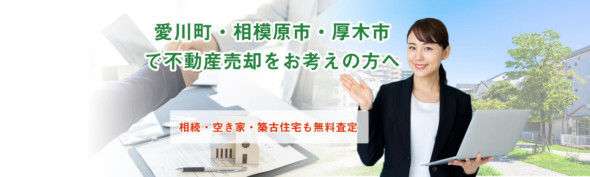 相模原市・愛川町・厚木市の相続物件・空き家・空地の売却を得意としております。あなたの不動産を高額で迅速に売却いたします。